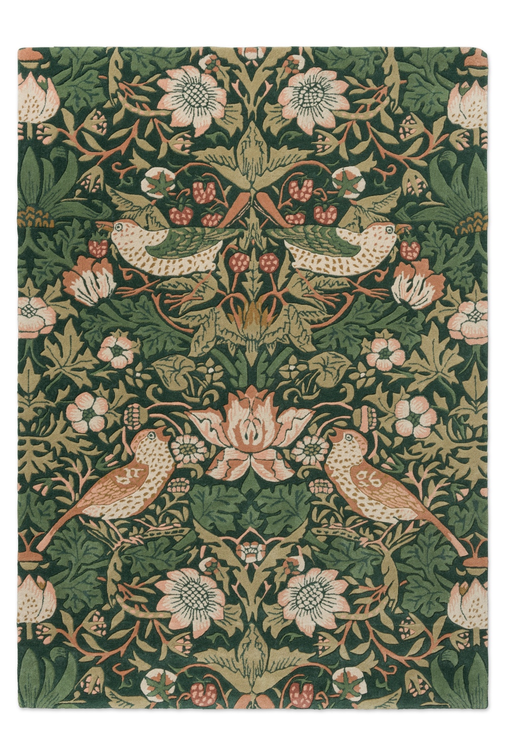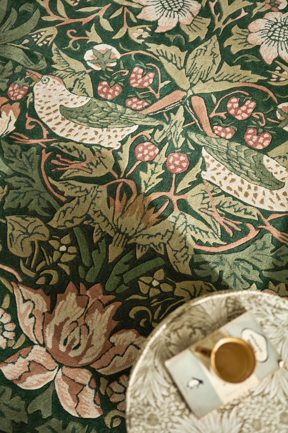 Designový koberec Morris & Co Strawberry Thief Forest přináší do interiéru ikonický vzor inspirovaný historickým designem Williama Morrise, který vznikl v roce 1883 a je považován za jeden z jeho nejznámějších motivů. Motiv znázorňuje ptáky (drozdovité) pochytávající jahody mezi bohatou florou, což dodává koberci jedinečný příběh a vizuální hloubku. Tento koberec je ručně tuftovaný a vyrobený z 100 % čisté nové vlny, což zaručuje měkký a komfortní pocit pod nohama i dlouhodobou odolnost. Vysoká hustota vlasu přispívá k příjemné textuře a trvanlivosti, takže je koberec vhodný do obývacího pokoje, ložnice nebo jiných obytných prostor. Vzor Strawberry Thief je tradičně bohatý, s množstvím detailů v široké paletě sytých barev (např. hnědé, zelené, červené a žluté vůči vínové hroznové barvě), která působí elegantně a zároveň útulně. Tento design dodá vašemu interiéru historickou atmosféru s nádechem viktoriánského stylu, ale zároveň se skvěle kombinuje i s moderním či klasickým vybavením. Vyroben z čisté vlny. Koberec je ručně vyroben v Indii. Výška vlasu 17 mm, kvalita 2500 g/m2. Koberec je vhodný i pro podlahové vytápění. Tento text je chráněn autorským právem, právem na ochranu v hospodářské soutěži a trestním právem.