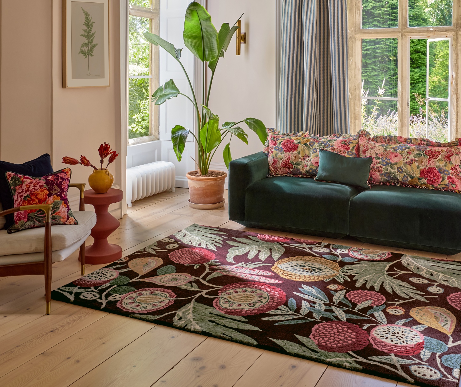 Designový koberec Sanderson Jackfruit Cherry – Alabast zaujme svým exotickým květinovým motivem inspirovaným plody jackfruit a třešněmi, které jsou stylově zpracované do jemného vzoru na světlém alabastrovém pozadí. Vzor působí hravě a zároveň elegantně, což z něj činí ideální doplněk, který dodá interiéru vizuální charakter a teplou atmosféru. Koberec je vyroben z kvalitní kombinace materiálů – 95 % čisté nové vlny a 5 % viskózy, což zajišťuje příjemný pocit pod nohama a zároveň jemný lesk a akcentace barev vzoru. Vlna poskytuje komfort, tepelnou izolaci a odolnost, zatímco viskóza přidává jemný vizuální lesk a hloubku barev. Kvalita koberce je 1500 g/m2 , výška vlasu 3 mm. Koberec je vhodný i pro podlahové vytápění. Tolerance velikosti dodávaných koberců je +/- 5%. Tento text je chráněn autorským právem, právem na ochranu v hospodářské soutěži a trestním právem. E-color.cz