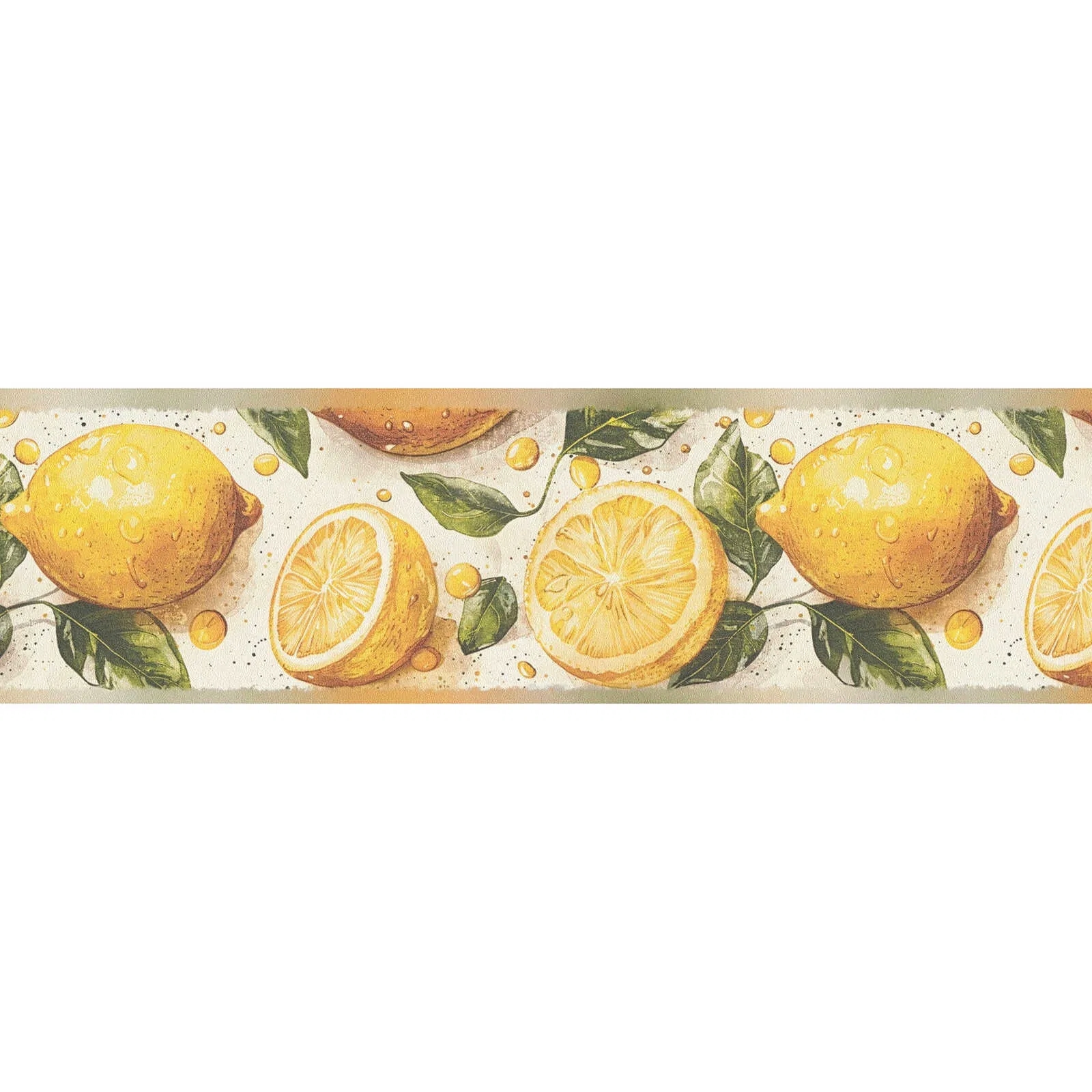 Moderní vliesí bordura A.S. Création SK-Borten s motivem Citrónů Lemon  v elegantních odstínech zelené, žluté a bílé představuje stylový doplněk pro váš interiér. Matný hladký povrch působí luxusně a díky decentnímu tvaru se hodí jak do moderních, tak klasických prostor.
