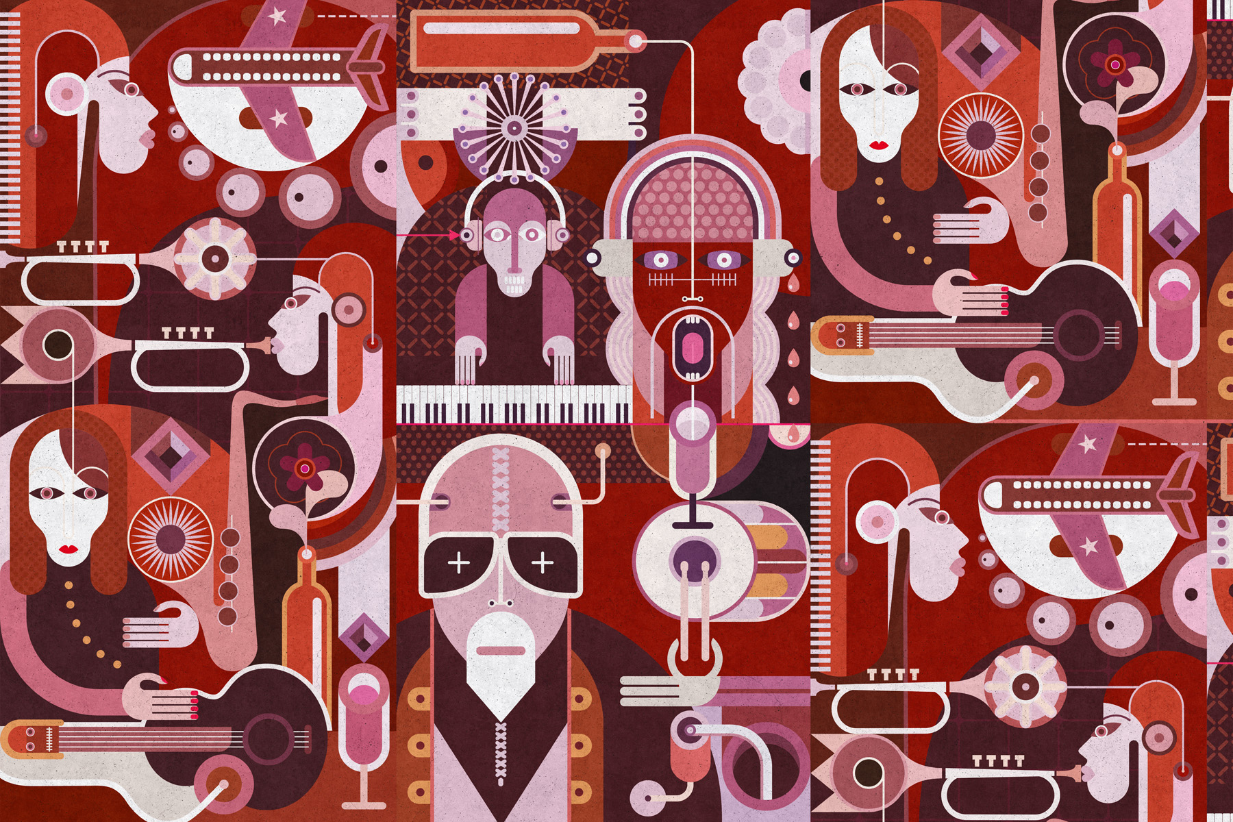 Výrazný obraz na plátně zobrazuje stylizovaný svět hudby plný postav a hudebních nástrojů, jako jsou kytary, klávesy, mikrofony a dechové nástroje. Celá kompozice je složena z geometrických tvarů a ilustrativních postav s výraznými rysy, které dohromady vytvářejí živou, rytmickou a dynamickou scénu. Převládající červené, vínové a růžové tóny dodávají obrazu energii a hloubku. Tento obraz je ideální jako dominantní dekorace do obývacího pokoje, pracovny, hudebního studia, kavárny nebo moderního interiéru. Skvěle osloví milovníky hudby, designu a originálního umění.