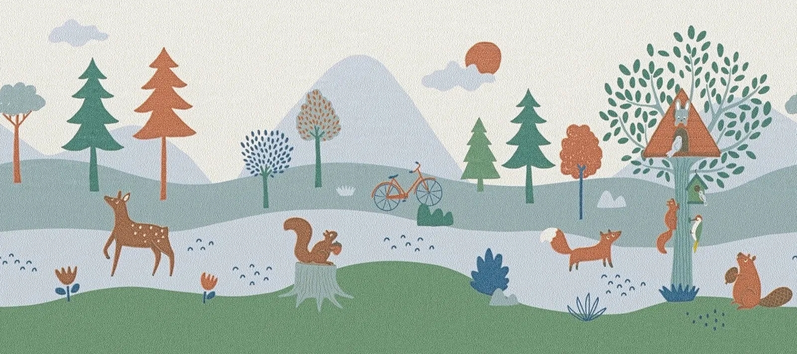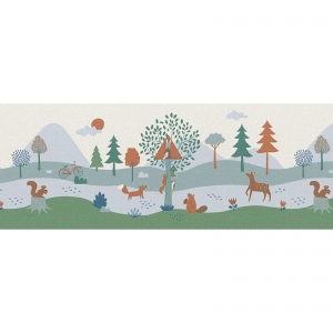 Dodejte dětskému pokoji přírodní kouzlo s vliesovou bordurou A.S. Création SK-Borten s motivem lesních zvířátek. Jemné odstíny zelené, šedé a hnědé barvy společně s veselými ilustracemi lišek, zajíčků a stromů vytvářejí útulnou a hravou atmosféru.