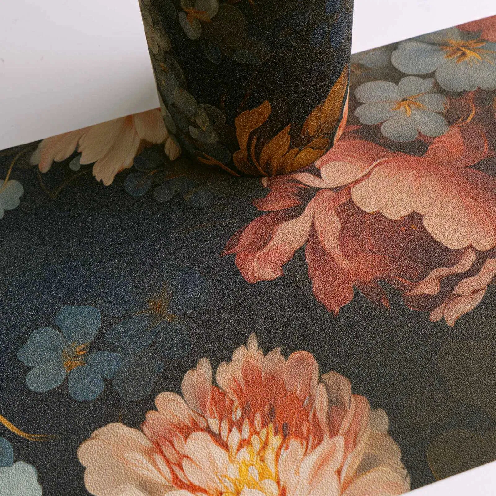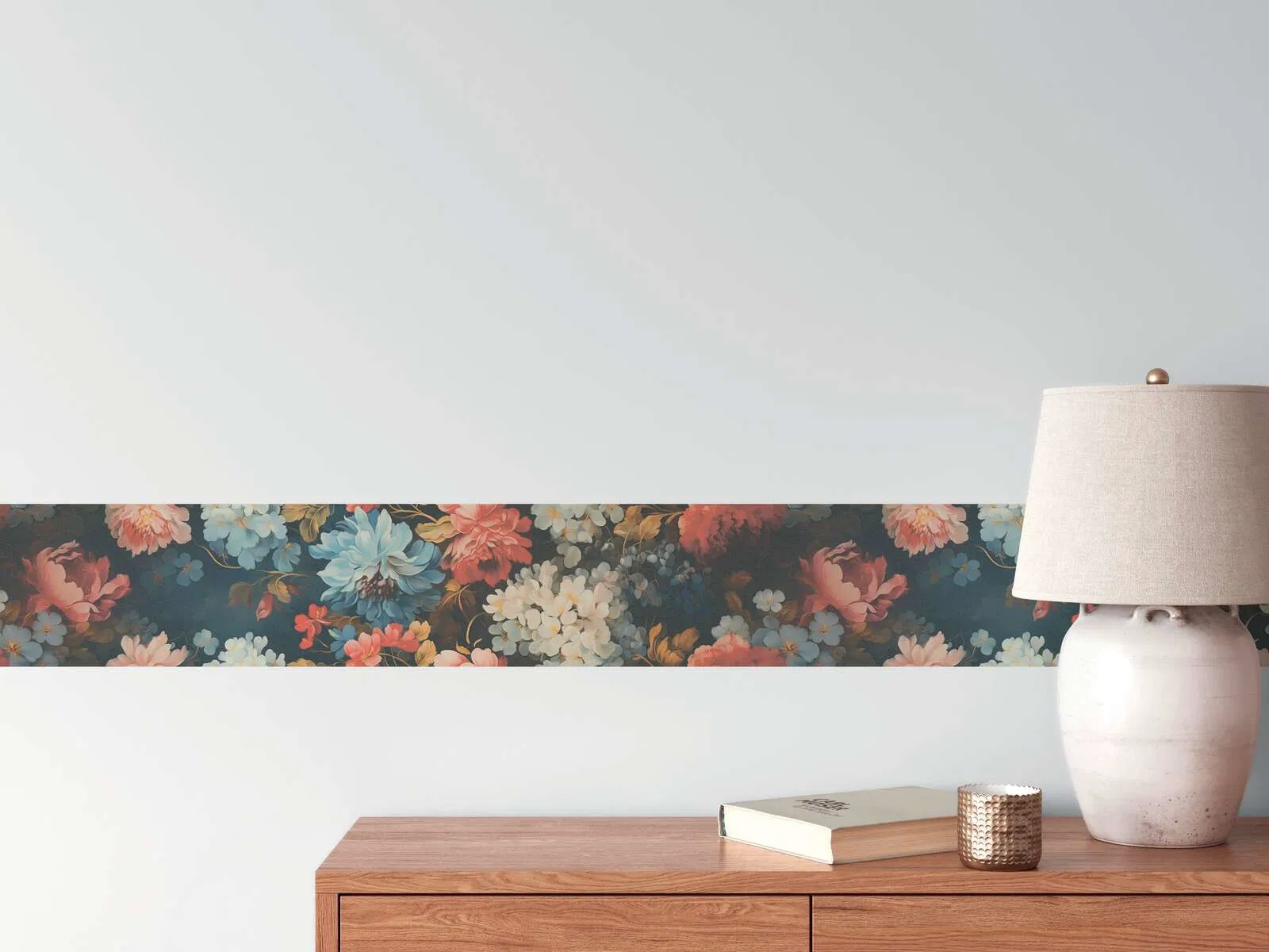 Elegantní vliesová bordura A.S. Création SK-Borten přináší do interiéru výrazný květinový motiv v teplých odstínech na tmavém podkladu. Spojení velkých květů a jemného matného povrchu vytváří luxusní vzhled, který oživí každý prostor – od chodby až po obývací pokoj či kuchyň.