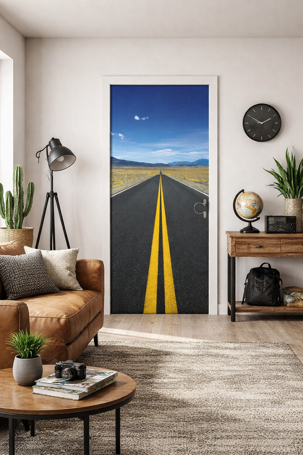 Dveřní fototapeta s motivem dlouhé rovné silnice mizící v dálce navozuje pocit svobody, prostoru a nekonečna. Kontrast temného asfaltu, výrazného žlutého značení a otevřené krajiny s horami pod modrou oblohou opticky prohloubí interiér a dodá mu dynamiku.