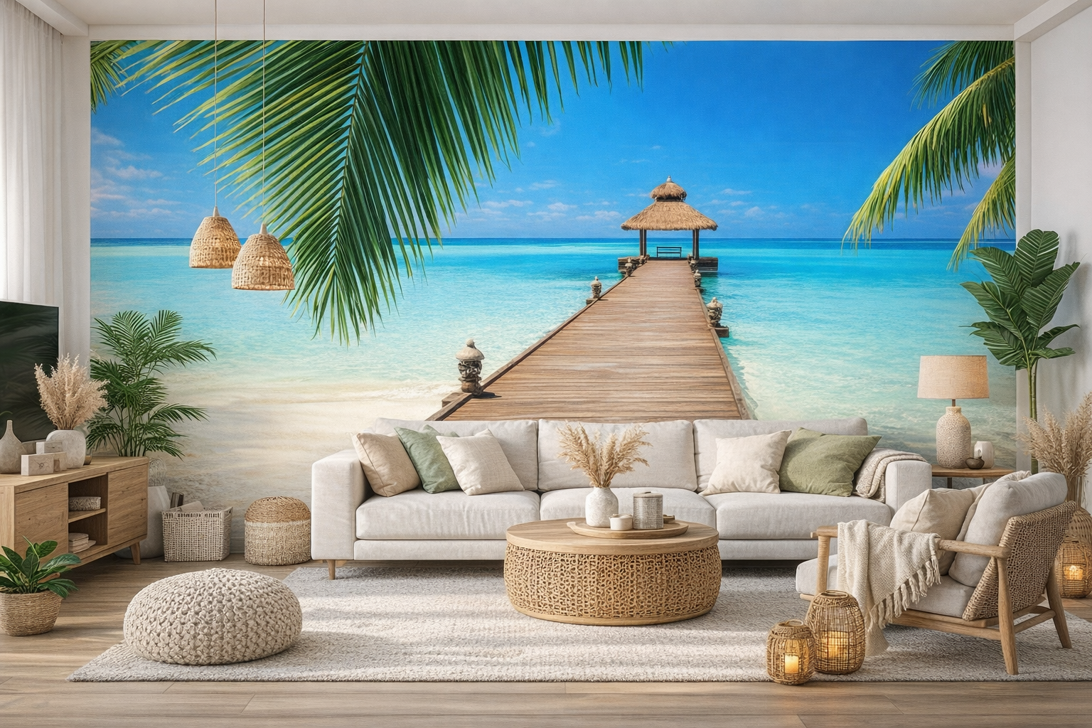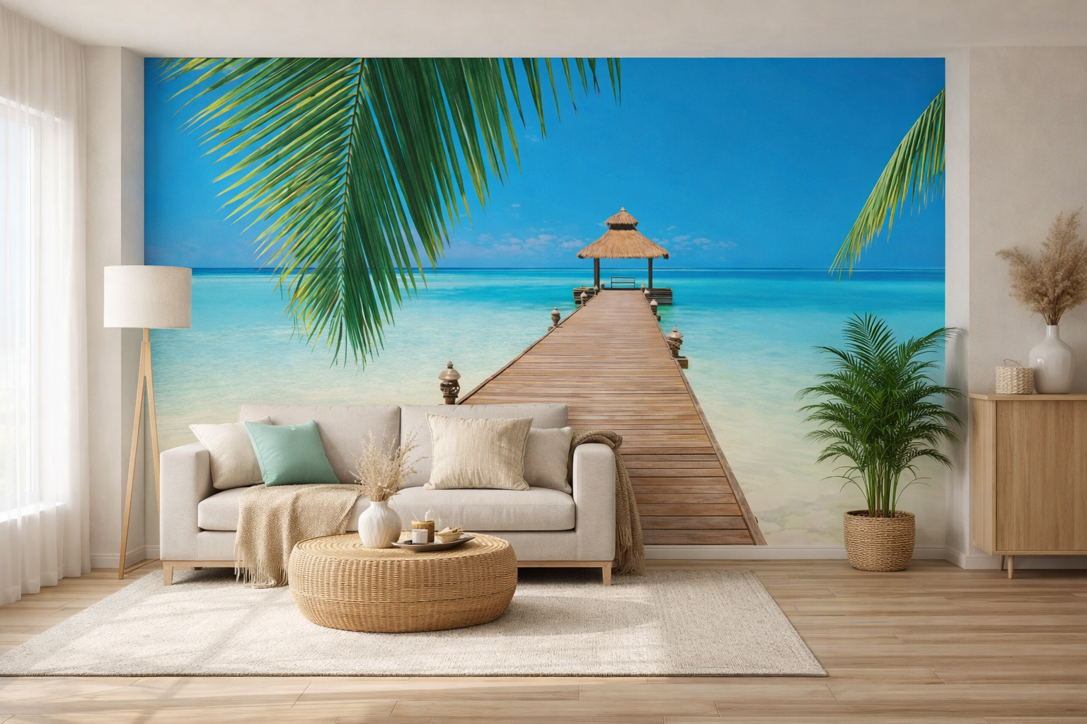 Vneste do svého interiéru atmosféru exotické dovolené. Tato nástěnná fototapeta s dřevěným molem vedoucím do průzračného tyrkysového moře navozuje pocit klidu, relaxace a nekonečného léta. Palmové listy v popředí dodávají scéně přirozený tropický rám a hloubku. Fototapeta je ideální do obývacího pokoje, ložnice, relaxační zóny, kanceláře nebo wellness prostoru. Díky realistickým barvám opticky zvětšuje místnost a vytváří harmonickou, uklidňující atmosféru. Fototapeta se skládá z osmi dílů. Součástí balení je lepidlo. Doporučené pomůcky pro nalepení fototapety najdete v doplňujícím zboží.