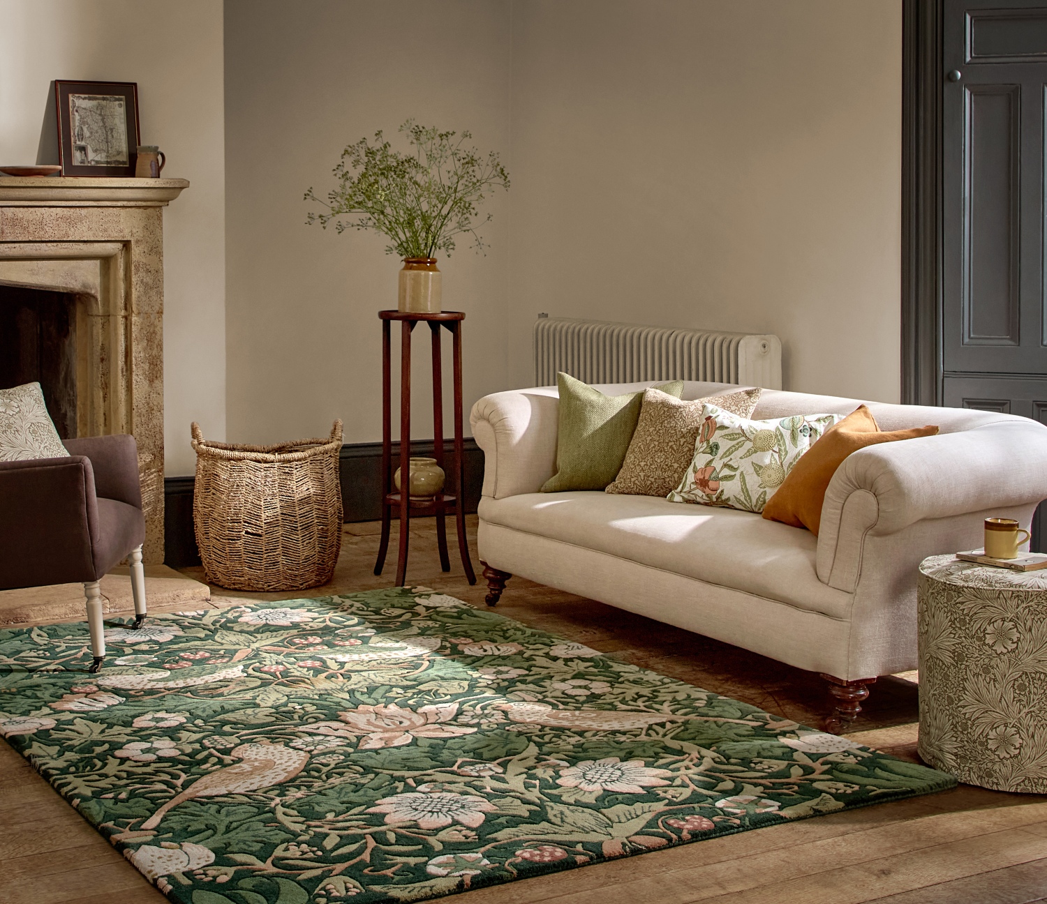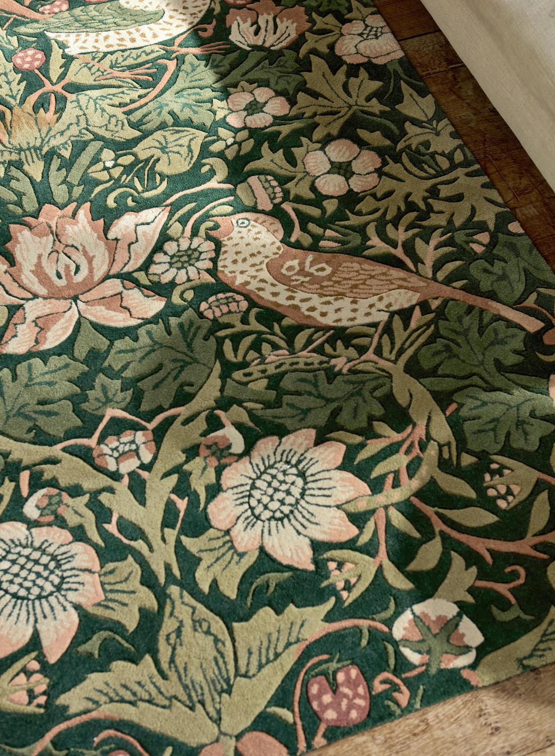 Designový koberec Morris & Co Strawberry Thief Forest přináší do interiéru ikonický vzor inspirovaný historickým designem Williama Morrise, který vznikl v roce 1883 a je považován za jeden z jeho nejznámějších motivů. Motiv znázorňuje ptáky (drozdovité) pochytávající jahody mezi bohatou florou, což dodává koberci jedinečný příběh a vizuální hloubku. Tento koberec je ručně tuftovaný a vyrobený z 100 % čisté nové vlny, což zaručuje měkký a komfortní pocit pod nohama i dlouhodobou odolnost. Vysoká hustota vlasu přispívá k příjemné textuře a trvanlivosti, takže je koberec vhodný do obývacího pokoje, ložnice nebo jiných obytných prostor. Vzor Strawberry Thief je tradičně bohatý, s množstvím detailů v široké paletě sytých barev (např. hnědé, zelené, červené a žluté vůči vínové hroznové barvě), která působí elegantně a zároveň útulně. Tento design dodá vašemu interiéru historickou atmosféru s nádechem viktoriánského stylu, ale zároveň se skvěle kombinuje i s moderním či klasickým vybavením. Vyroben z čisté vlny. Koberec je ručně vyroben v Indii. Výška vlasu 17 mm, kvalita 2500 g/m2. Koberec je vhodný i pro podlahové vytápění. Tento text je chráněn autorským právem, právem na ochranu v hospodářské soutěži a trestním právem.